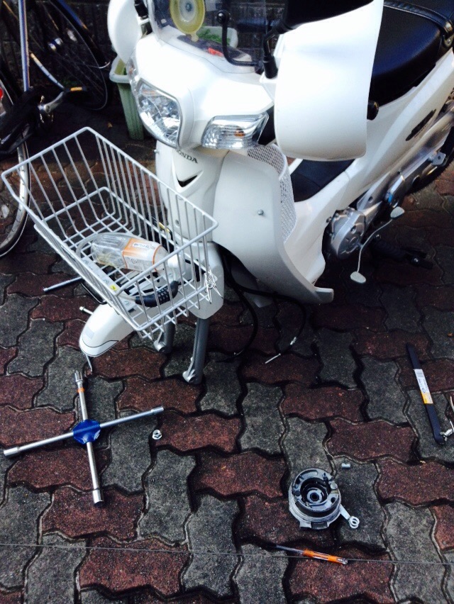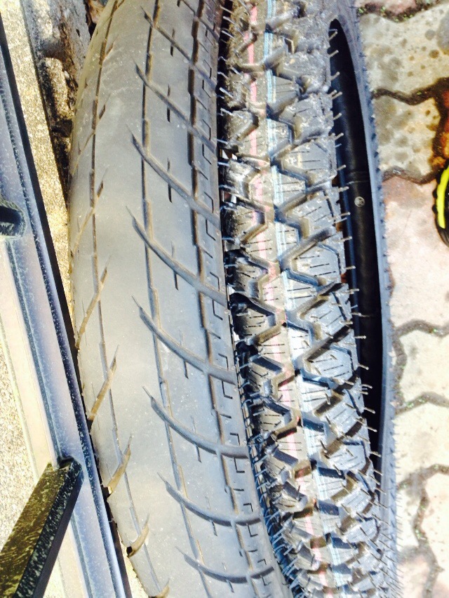 冬タイヤに交換 2014年12月15日未分類sobakopan タイヤも減って来たので、ネットでタイヤを注文。この際、冬タイヤに交換です。 タイヤのサイズは前後17インチ 2.50。 タイヤサイズが細くなりました。 まずは後輪から。車軸を外します。 タイヤの取り外し完了。 タイヤ交換は結構力が必要。硬かったです。汗) 続いて前タイヤ。 交換完了。タイヤ自体が柔らかいのですぐに減りそうですが、雪が楽しみです。笑)